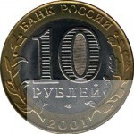 центр — знак достоинства монеты. В цифре нуль можно разглядеть при определенных углах взгляда цифры 10 и слова «РУБЛЕЙ». Ниже расположен знак монетного двора. Вверху - "Банк России", в нижней части — «2001», побокам - растительный орнамент.